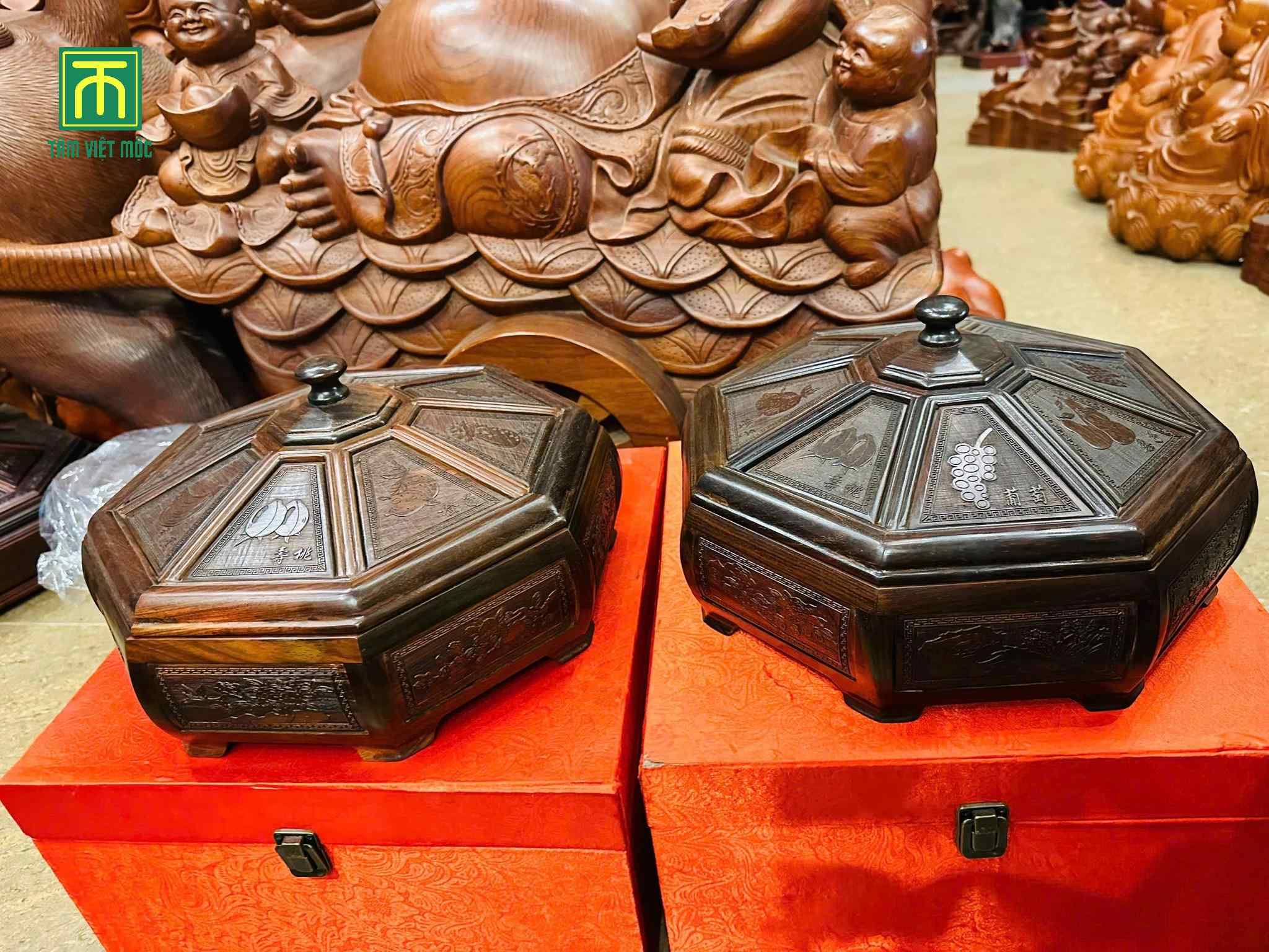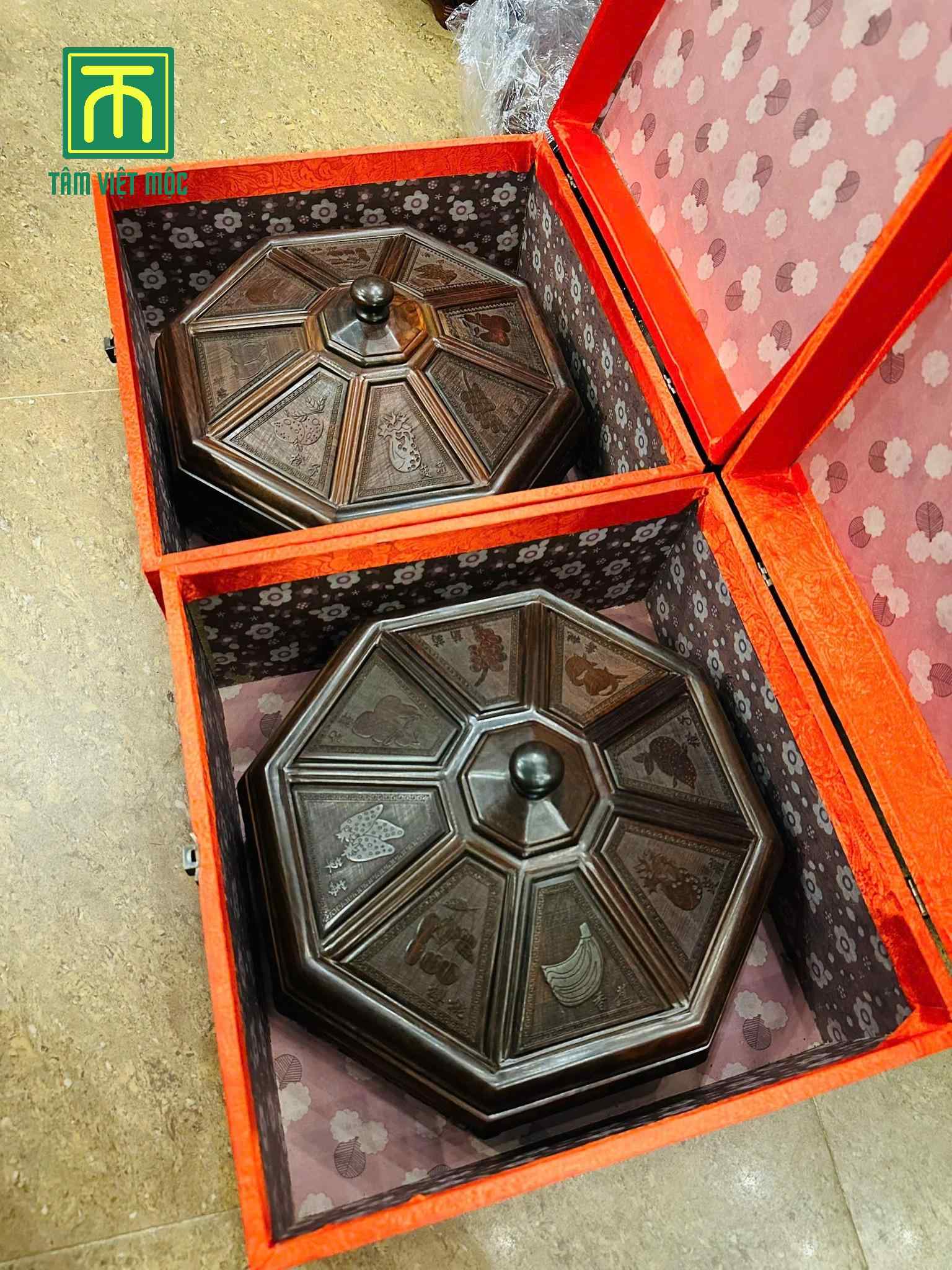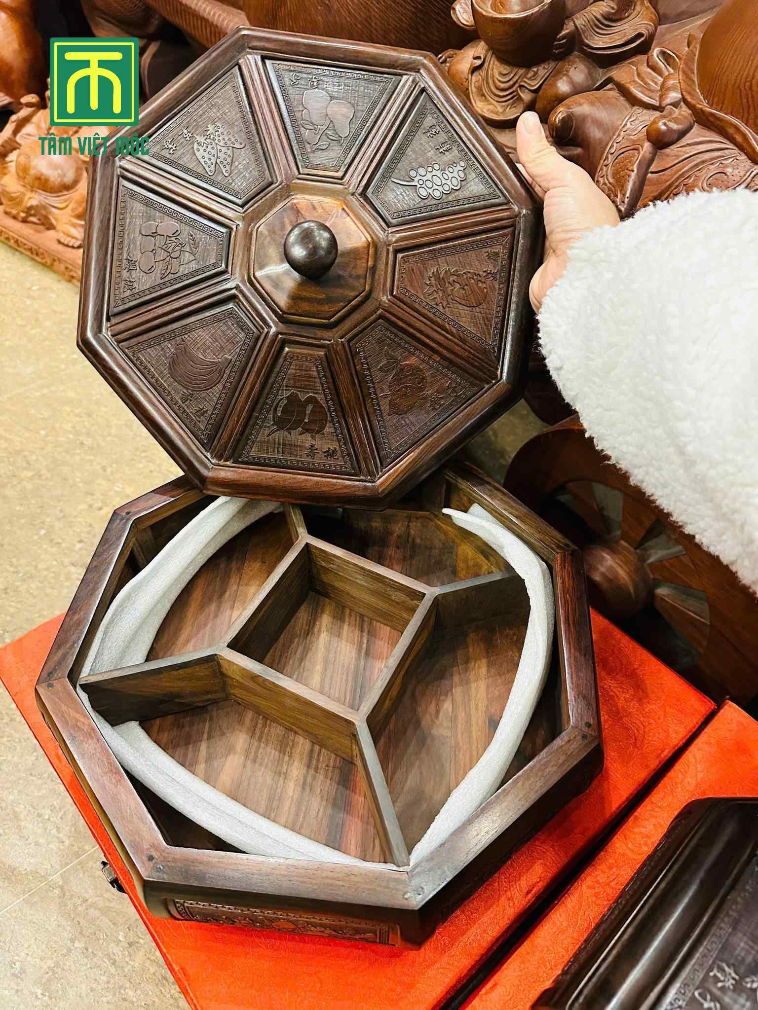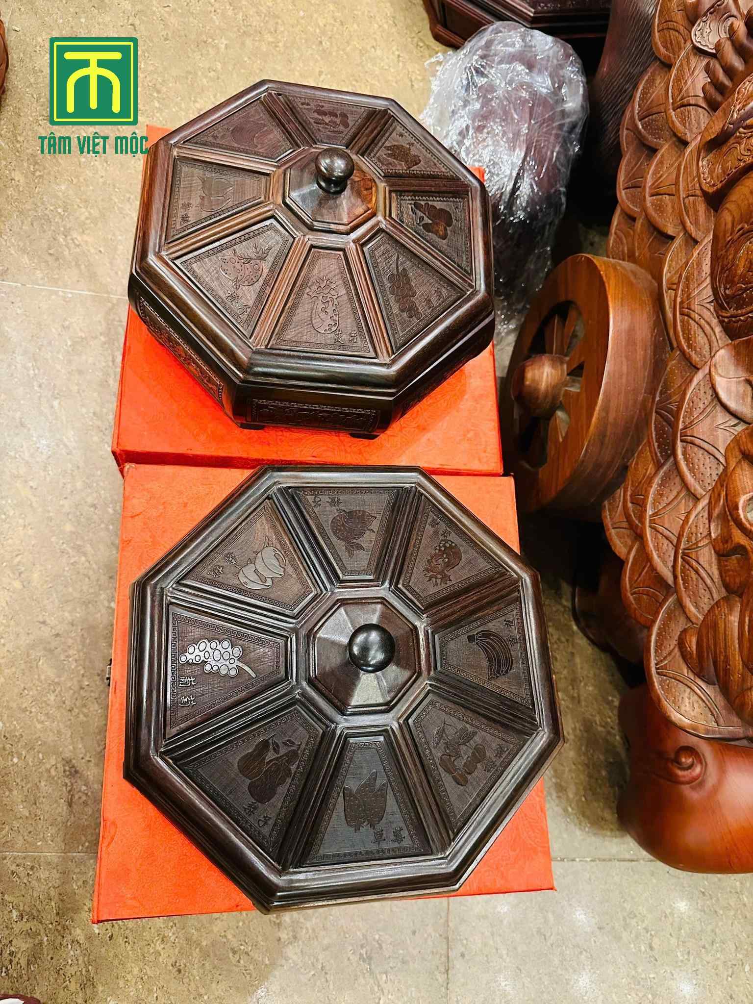 Trang chủ / Khay đựng bánh kẹo / Khay đựng bánh kẹo tết 5 ngăn gỗ trắc đường kính 37 cao 20